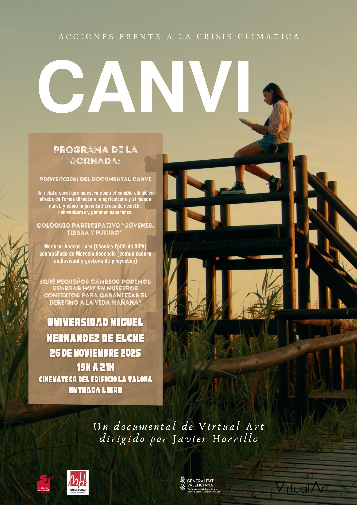 El Vicerectorat de Cultura, Igualtat i Diversitat de la Universitat Miguel Hernández d’Elx ha posat en marxa el Club de Cine – UMH, un lloc de trobada de persones especialistes en el sèptim art el proper dimecres, 26 de novembre, a les 19:00 hores, a la Cinemateca de l’edifici La Valona del campus d’Elx. En aquesta ocasió es presenta el documental Canvi, de Javier Horrillo.